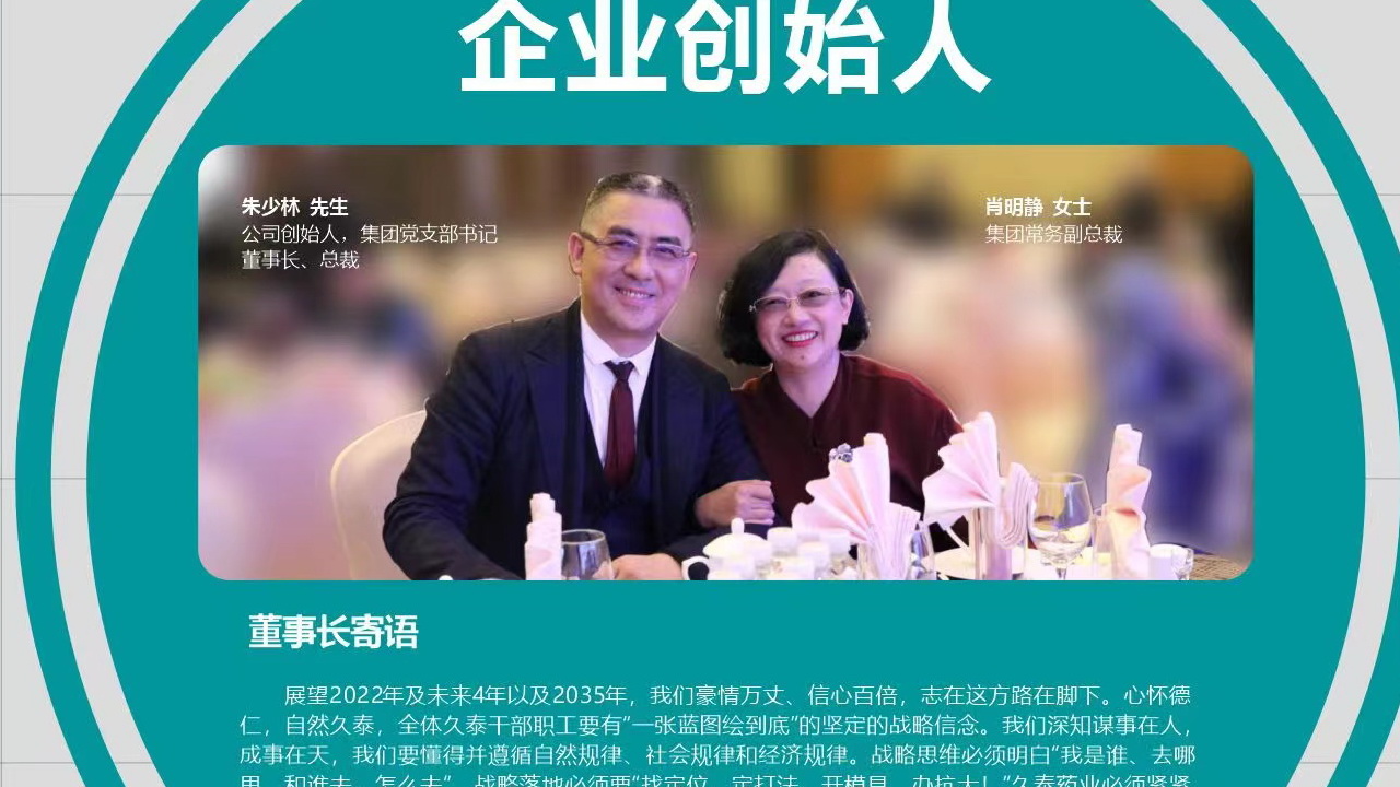 久泰使命:為人類(lèi)治病防病和健康水平的提高作貢獻(xiàn)!久泰愿景:受顧客、員工、股東歡迎,讓行業(yè)和社會(huì)尊重!久泰戰(zhàn)略:以顧客為中心,以?shī)^斗者為本,永葆艱苦創(chuàng)業(yè),以回報(bào)社會(huì)為榮!實(shí)現(xiàn)戰(zhàn)略目標(biāo)的路徑:科學(xué)發(fā)展,文化助推!誠(chéng)實(shí)勞動(dòng),勤奮工作,一絲不茍,精益求精!久泰價(jià)值觀(guān):讓客戶(hù)價(jià)值、員工價(jià)值大化!久泰信念:世上無(wú)事不可為,一切皆有可能!久泰作風(fēng):快捷、認(rèn)真、一諾千金。